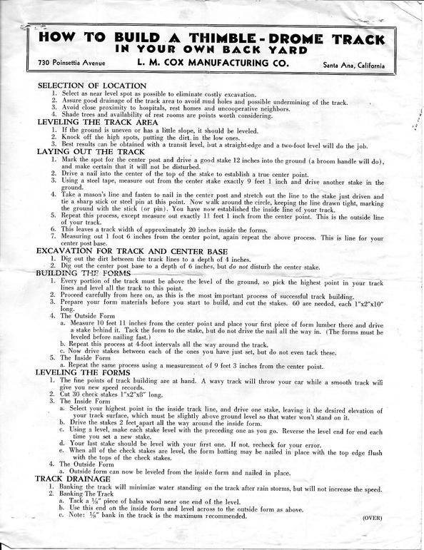 As the popularity of mite car racing took off, hundreds of smaller tether car tracks designed specifically for mite car racing sprang up around the country. Leading that effort was Roy Cox, who developed a set of detailed plans for building a mite car track.