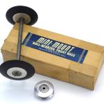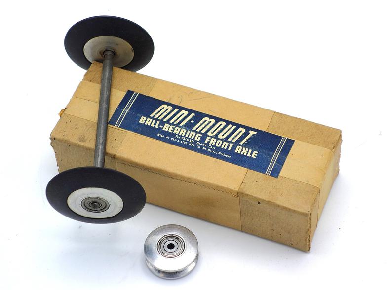 This car is fitted with all of the parts which Pac-A-Lite Mfg. Co. offered for converting an unpowered Thimble Drome Champion toy race car into a competitive tether racer: the Mini-Mount drive unit, the bridle bracket kit, and the ball bearing front wheels and axle kit. Thimble Drome tires were mounted on the front wheels and 2 1/2 inch Veco tires and wheels were mounted on the rear. The installation of the Mini-Mount drive unit was rather crudely done, so the car was obviously not one which was purchased as a complete ready-to-race car from Pac-A-Lite.