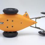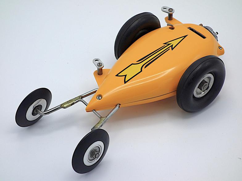 The car was patterned after the Hornet .60-powered Matthews V-Car which was the first tether car to exceed 100 mph. Like the V-Car, the mite car was teardrop-shaped with the engine cylinder head exposed at the front of the car. The two-piece body was short and stubby, and was cast in either magnesium or aluminum. Included in the kit were a set of 2 to 1 spur gears, an A-shaped stainless steel trailing axle, and a pair of