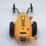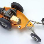 The car shown in the photos was built from one of those kits and has a magnesium body and engine mount. The car is powered by a McCoy 19 race car engine and is fitted with a custom-made copper fuel tank, along with a pair of Real McCoy rear wheels and 3-inch diameter semi-pneumatic tires mounted on the drive axle.