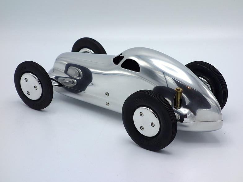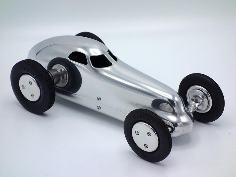 The design of the car was inspired by the iconic Ralph Schenck streamliner, one of the first enclosed cars to compete on the dry lake beds in the Mohave Desert. Ralph Schenck built the chassis of his streamliner and powered it with a four cylinder 183 cubic inch Chevrolet block fitted with a 3-port Oldsmobile head, Ford Model B crankshaft and rods, a Hudson water pump, and a Winfield camshaft. The aluminum body panels were hand-formed by Joaquin Grosso.