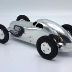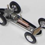 In addition to the two-piece, hand-formed sheet aluminum body, David fabricated the copper fuel tank and the machined aluminum front axle. The 2.5 cc twin-shaft diesel engine, fuel tank and front axle assembly are mounted on an aluminum plate sub-frame to which the pan is attached. Hornet Mite wheels and tires are mounted on all four corners.