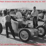 The Schenck streamliner debuted at the May 19, 1940 SCTA meet at Harper Dry Lake where it ran 118.57 mph. Schenck raced the car for a number of years and his best time with the four cylinder Chevrolet engine was 126.89 mph. He also was alleged to have driven the car on the street during World War II, never bothering to install lights or a license plate. Schenck sold the car in 1945.