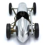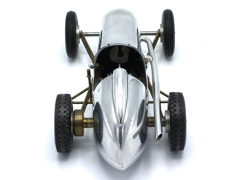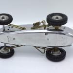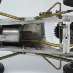The ladder frame-design chassis was fabricated from 1/2 by 3/16 inch aluminum bar stock with machined aluminum cross members. The engine, fuel tank, and running gear were then secured to the chassis, as were the polished aluminum body panels. The individual body panels were hand-formed from sheet aluminum using a hardwood buck as a pattern. The front and rear radius rods were formed from brass rod.