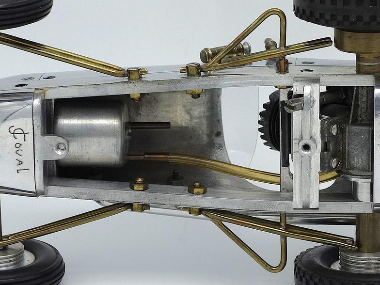 The car is powered by a Fuji .099 "Menasco series" model engine with direct drive powering the left rear wheel and a stub axle for the unpowered right rear wheel.