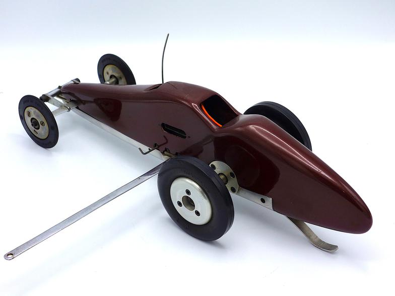 After being raced successfully in England by Jim Dean, the car was sold to an American tether car competitor, Joe Ellis of San Francisco, CA.