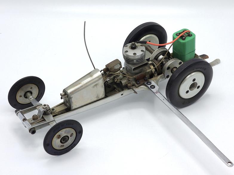 The car is powered by a Dooling 29 model engine with glow plug ignition. The trip wire serves two purposes: it closes the plunger-style fuel shut-off and it also shuts off the electric current from the battery pack to the glow plug.