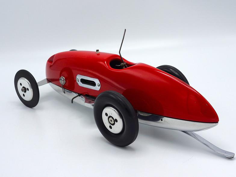 A number of veteran tether car racers, and several other knowledgeable individuals, have looked at this car in an effort to identify the builder. A veteran tether car racer from Chicago suggested that the car might be a 1234 Mite, while it has also been suggested that the car might be an early Frymire mite car. But, thus far, I am not able to confirm who originally built and raced the car.