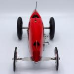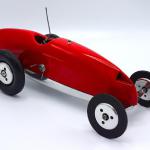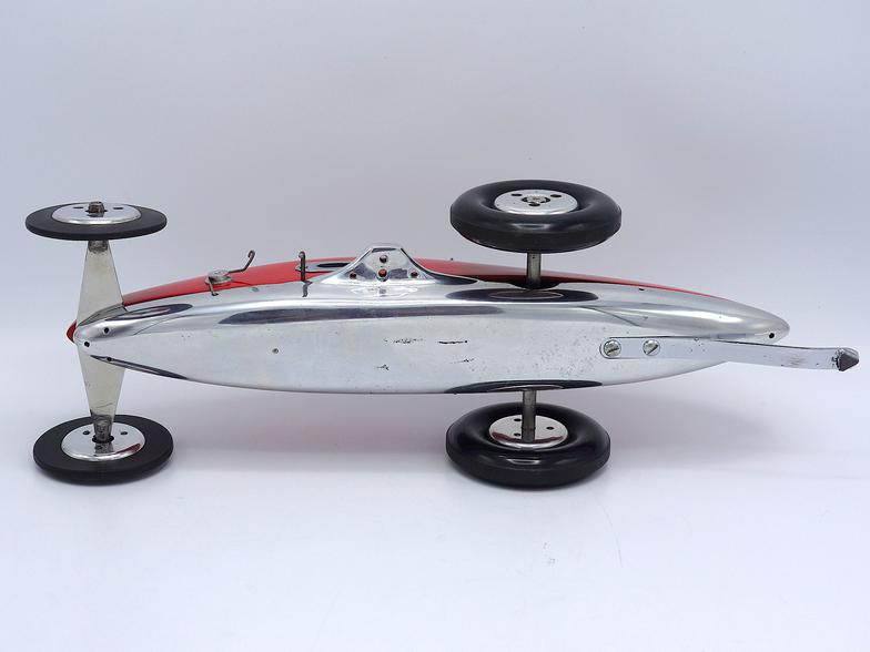 Nonetheless, the car is very racy! The cast aluminum pan appears to be from the late 1950s/early 1960s and does bear some resemblance to the .60-size 1234 pan. The body is hand carved wood. The two-piece aluminum wheels appear to be die-cast aluminum Hornet Mite wheels. The rear tires are 3 inch diameter C-R semi-pneumatic tires, while the
