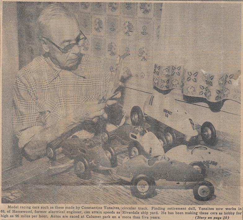 Constantine "Gus" Yonaites was a member of the Chicago Mite Car Club who raced on the club's portable 1/80th mile track as well as National Mite Race Car Association (NMRCA) sanctioned events held on 1/80th mile mite car tracks across the Midwest.