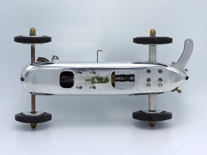 Then, 10 years later, Korn apparently installed the 1938 prototype gearbox in a modified pre-production 1948 Indianapolis series pan, powering the car with a Torpedo .29 ignition model engine.