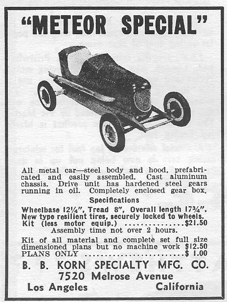 Barney Korn introduced his .60-size Meteor race car in 1938. Later that same year, Korn designed a smaller .29-size Meteor which he called the "Meteor series 29". The design of the bevel gear drive unit for the car was completed, and a prototype of the gearbox was produced. Not surprisingly, the gearbox bore a strong resemblance to a scalled-down version of the larger .60-size Meteor gearbox. At that point, the project was halted.