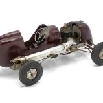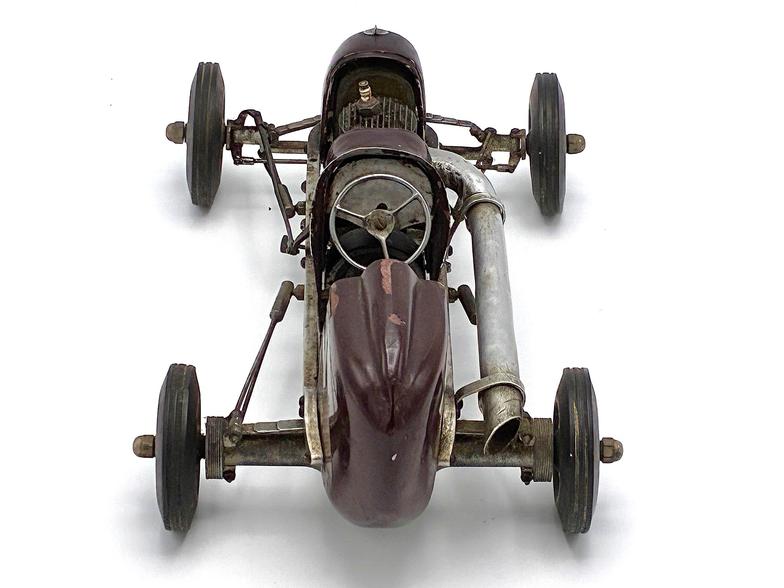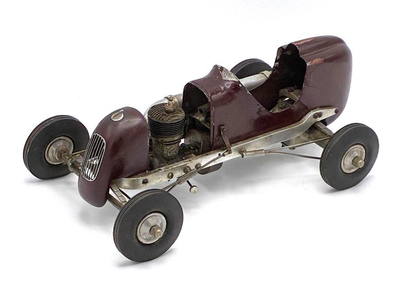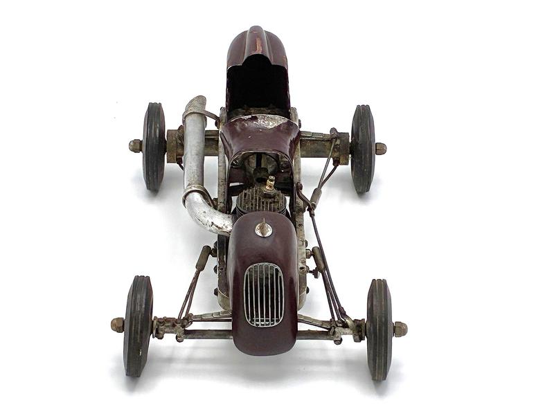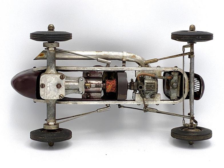 This Class A tether car was designed, built and raced by Virgil Thompson, who lived 60 miles south of Chicago near Kankakee, IL. Thompson was a skilled craftsman who, in addition to being employed as a tool and die maker, also owned a bicycle shop in Watseka, IL and built houses on the side (including his family's home on the Kankakee River).