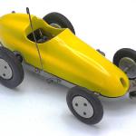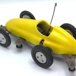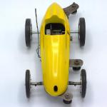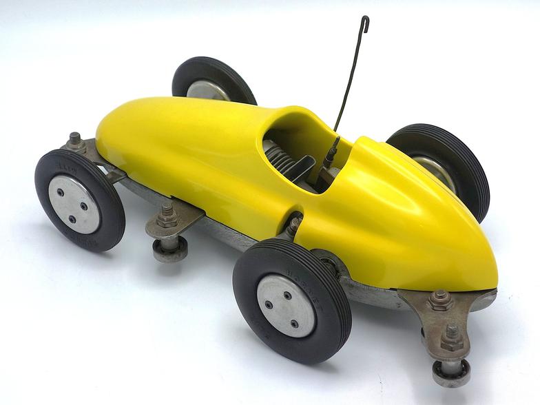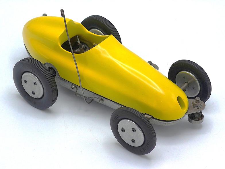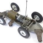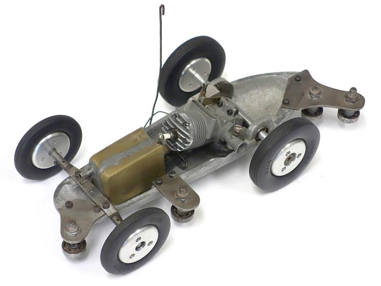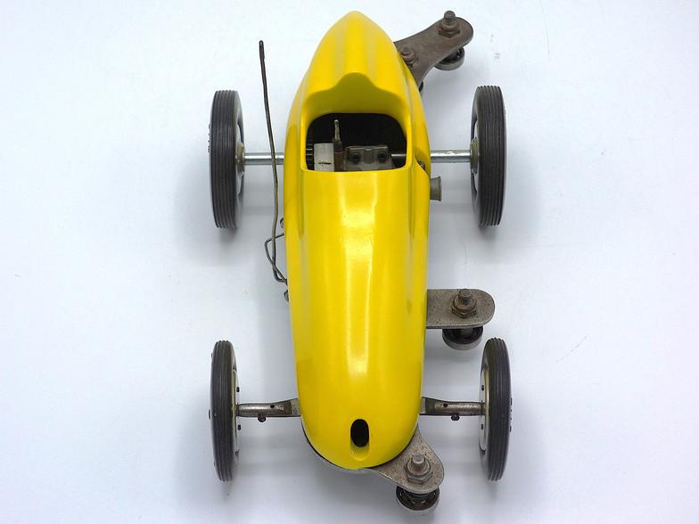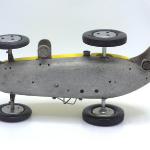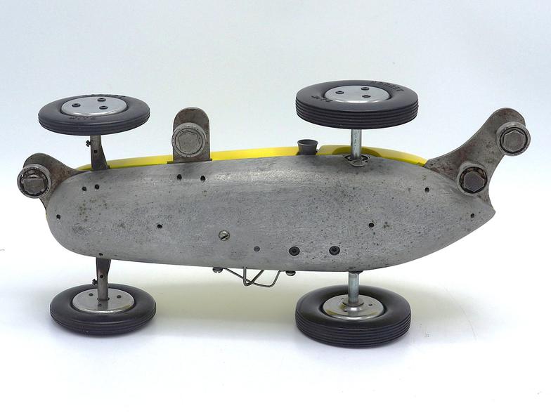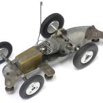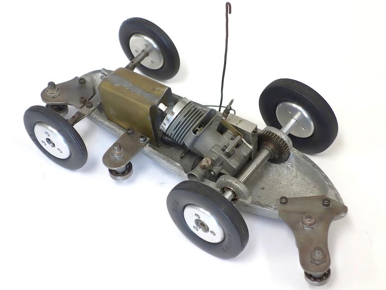 Legend has it that this car was an early prototype of the Babcock Rail Mite that ultimately became so successful as a mite sized rail racer. John Babcock is believed to have built this car to test an early design for a McCoy .19 powered spur-gear drive rail mite. Steel rail guide mounts were bolted to a cast aluminum pan and a rather crude engine mount and drive unit was fabricated.