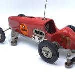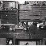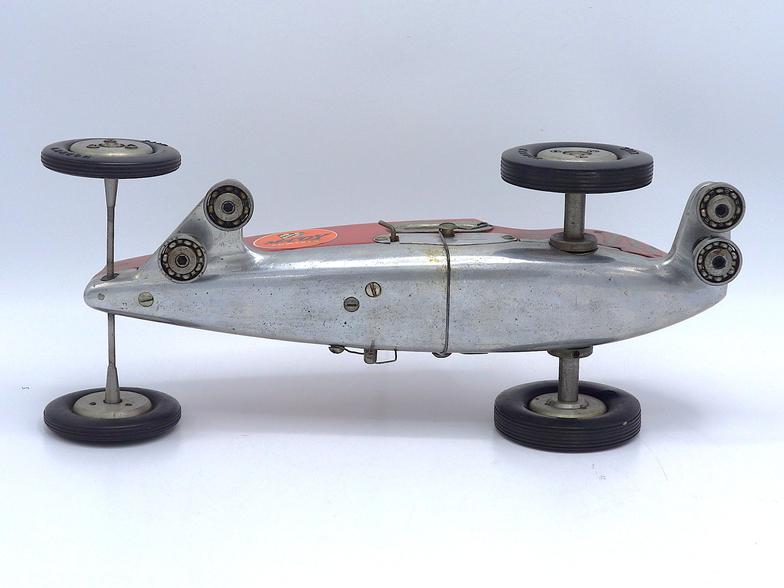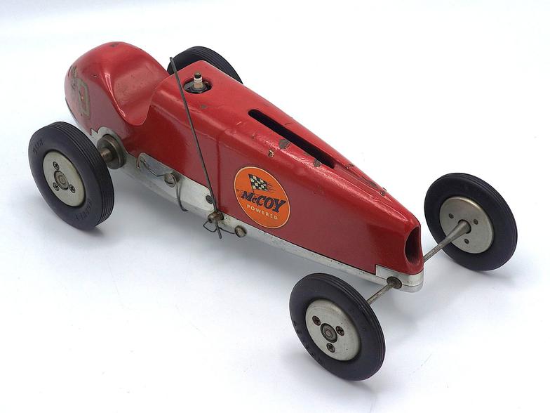 The car shown in the photos was John Carlson's personal McCoy .19 powered rail mite. Carlson raced the car briefly on the small indoor rail track owned by the Chicago Mite Car Club. The 1/48th mile, oval-shaped 4-rail track had 35 degree banked turns and was located in the basement of the Calumet Park field house in Chicago. Although the track was originally intended for .09-, .19- and .29-powered rail mites, it soon became apparent that the cars powered by the larger engines were simply too powerful for the small track and competition was then limited to .09-powered rail mites only.