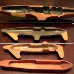 In designing his rail mite pans, John Carlson often simply modified the designs of his successful tether car pans by adding rail guide mounts to the sides of the wood patterns used to cast the pans. The photograph showing the different wood patterns for Carlson's pans clearly illustrates how he added rail guide mounts to what was originally a tether car pan pattern to produce the pattern for a rail mite pan.