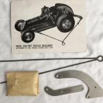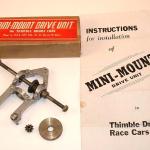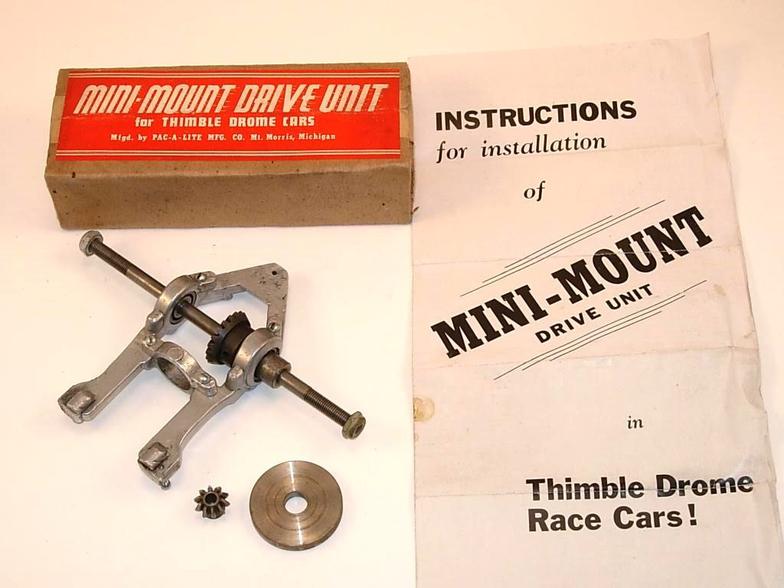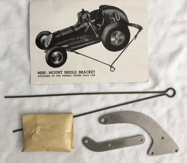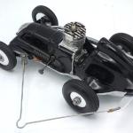 This car is fitted with all of the parts which Pac-A-Lite Mfg. Co. offered for converting an unpowered Thimble Drome Champion toy race car into a competitive tether racer: the Mini-Mount drive unit, the bridle bracket kit, and the ball bearing front wheels and axle kit. Thimble Drome tires were mounted on the front wheels and 2 1/2 inch Veco tires and wheels were mounted on the rear. The installation of the Mini-Mount drive unit was rather crudely done, so the car was obviously not one which was purchased as a complete ready-to-race car from Pac-A-Lite.