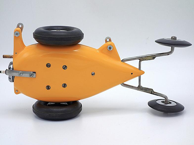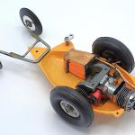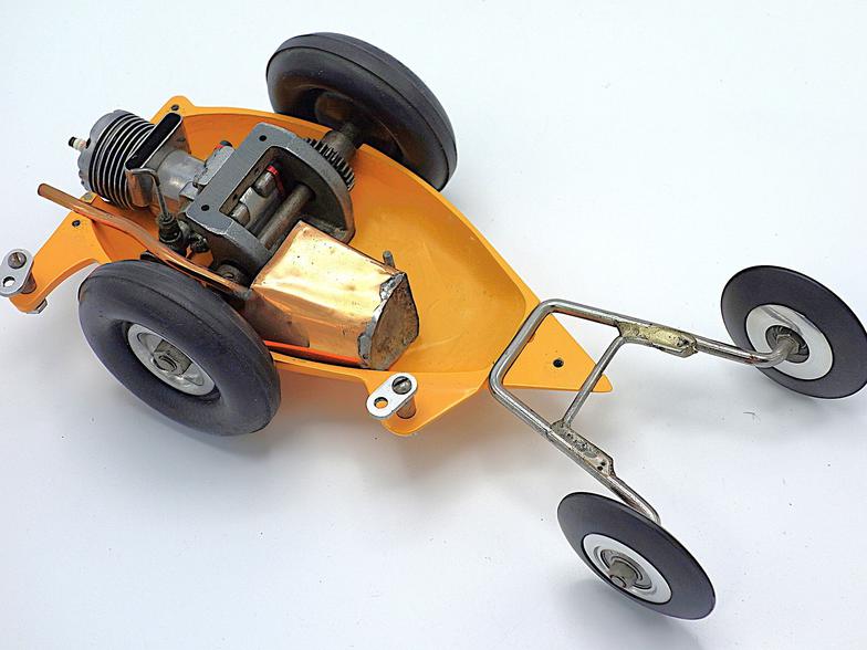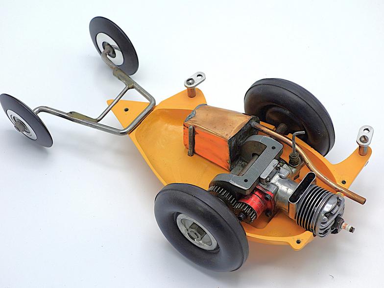 The car shown in the photos was built from one of those kits and has a magnesium body and engine mount. The car is powered by a McCoy 19 race car engine and is fitted with a custom-made copper fuel tank, along with a pair of Real McCoy rear wheels and 3-inch diameter semi-pneumatic tires mounted on the drive axle.