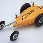 The car was patterned after the Hornet .60-powered Matthews V-Car which was the first tether car to exceed 100 mph. Like the V-Car, the mite car was teardrop-shaped with the engine cylinder head exposed at the front of the car. The two-piece body was short and stubby, and was cast in either magnesium or aluminum. Included in the kit were a set of 2 to 1 spur gears, an A-shaped stainless steel trailing axle, and a pair of