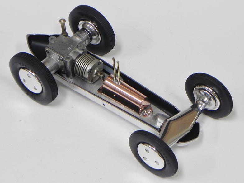 In addition to the two-piece, hand-formed sheet aluminum body, David fabricated the copper fuel tank and the machined aluminum front axle. The 2.5 cc twin-shaft diesel engine, fuel tank and front axle assembly are mounted on an aluminum plate sub-frame to which the pan is attached. Hornet Mite wheels and tires are mounted on all four corners.