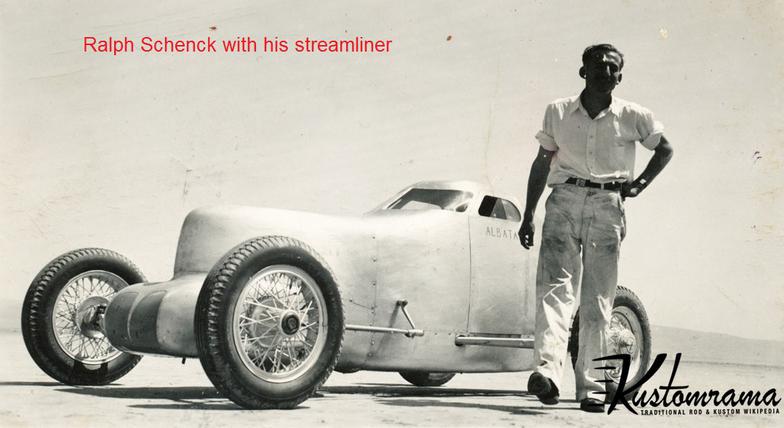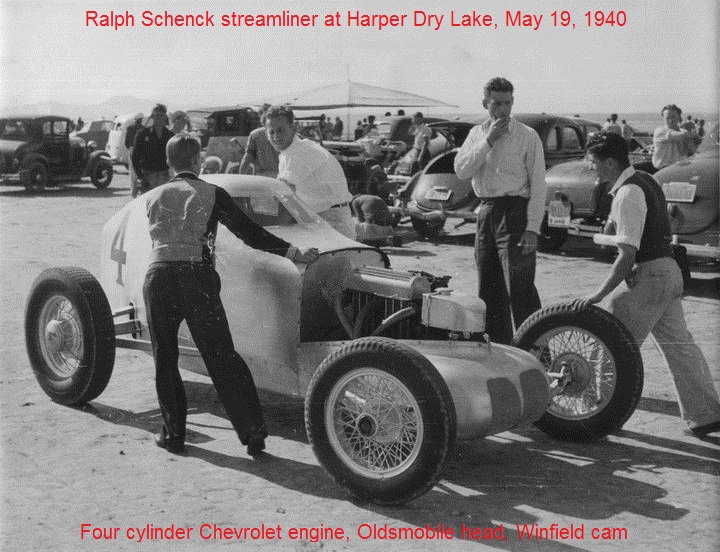 The Schenck streamliner debuted at the May 19, 1940 SCTA meet at Harper Dry Lake where it ran 118.57 mph. Schenck raced the car for a number of years and his best time with the four cylinder Chevrolet engine was 126.89 mph. He also was alleged to have driven the car on the street during World War II, never bothering to install lights or a license plate. Schenck sold the car in 1945.