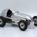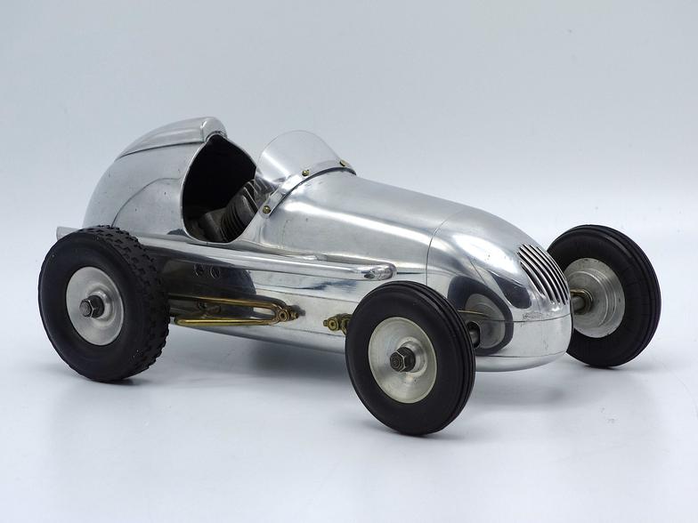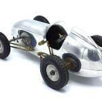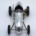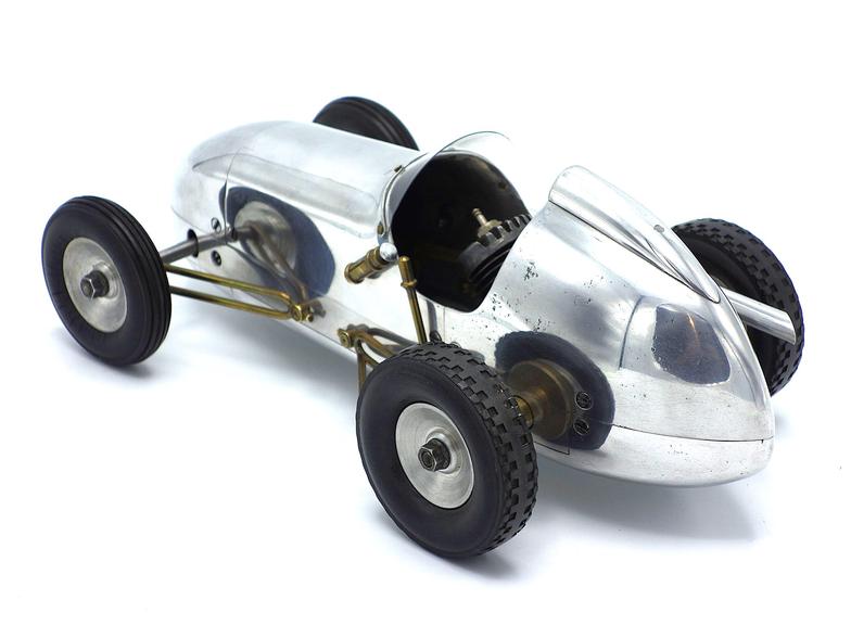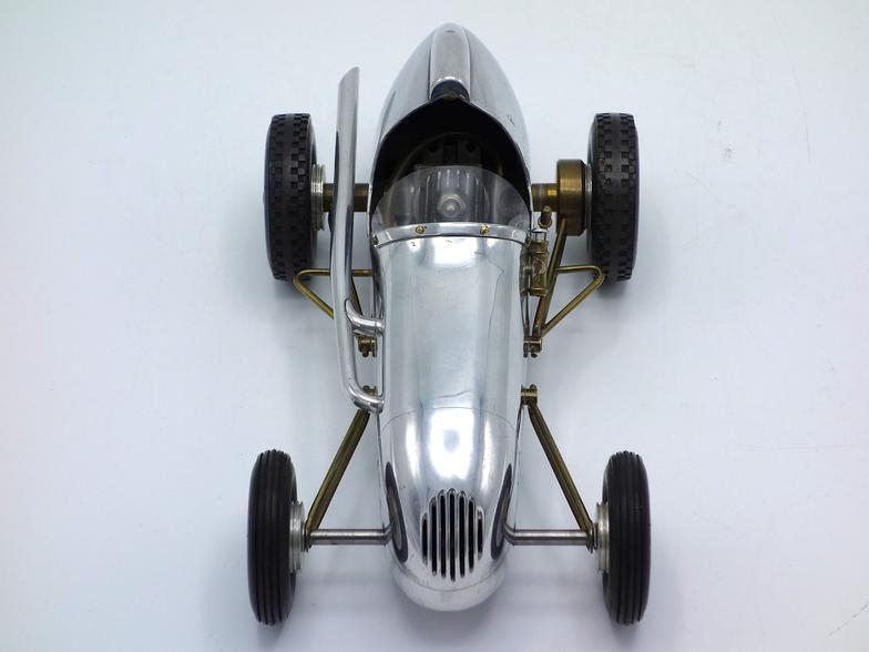 The ladder frame-design chassis was fabricated from 1/2 by 3/16 inch aluminum bar stock with machined aluminum cross members. The engine, fuel tank, and running gear were then secured to the chassis, as were the polished aluminum body panels. The individual body panels were hand-formed from sheet aluminum using a hardwood buck as a pattern. The front and rear radius rods were formed from brass rod.