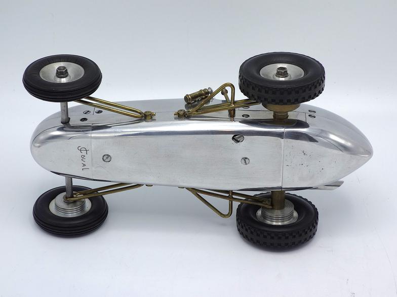 The car shown in the photos is a one-off, scratch-built scale model of a Kurtis-Kraft midget race car, designed and built by John Coval of Scottsdale, AZ.