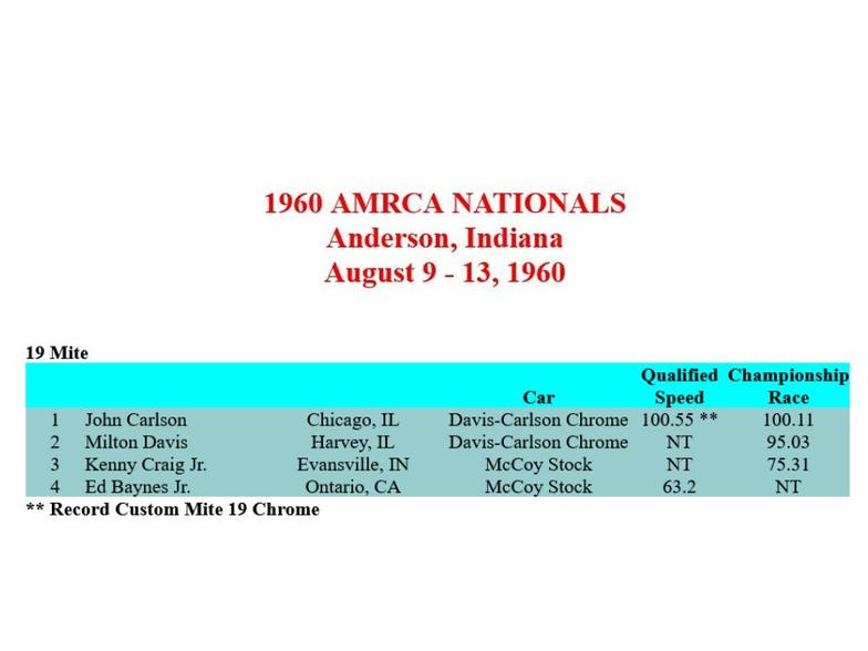 In the ten-year period from 1959 through 1968, the AMRCA Mite class was contested a total of eight times at the annual AMRCA National Championship Races, and Davis-Carlson Mites won either the .19-Mite class or the .29-Mite class, or both, in seven of those eight events.