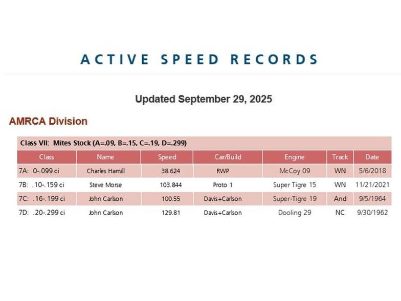 Further, John Carlson's personal Dooling 29 powered Davis-Carlson Mite still holds the .29-Mite class record today with a top speed of 129.81 mph established at the 1962 AMRCA Nationals on September 30, 1962. And his personal Super Tigre .19 powered Davis-Carlson Mite still holds the .19-Mite class record today with a top speed of 100.55 mph established at the 1960 AMRCA Nationals on August 13, 1960.