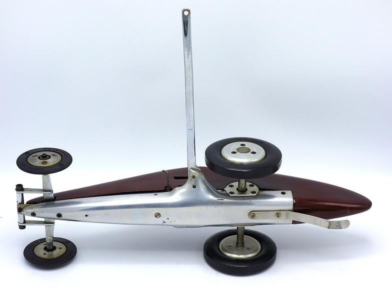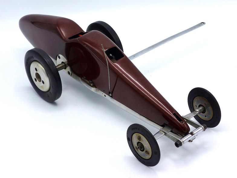 After being raced successfully in England by Jim Dean, the car was sold to an American tether car competitor, Joe Ellis of San Francisco, CA.