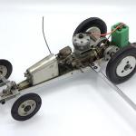 The car is powered by a Dooling 29 model engine with glow plug ignition. The trip wire serves two purposes: it closes the plunger-style fuel shut-off and it also shuts off the electric current from the battery pack to the glow plug.