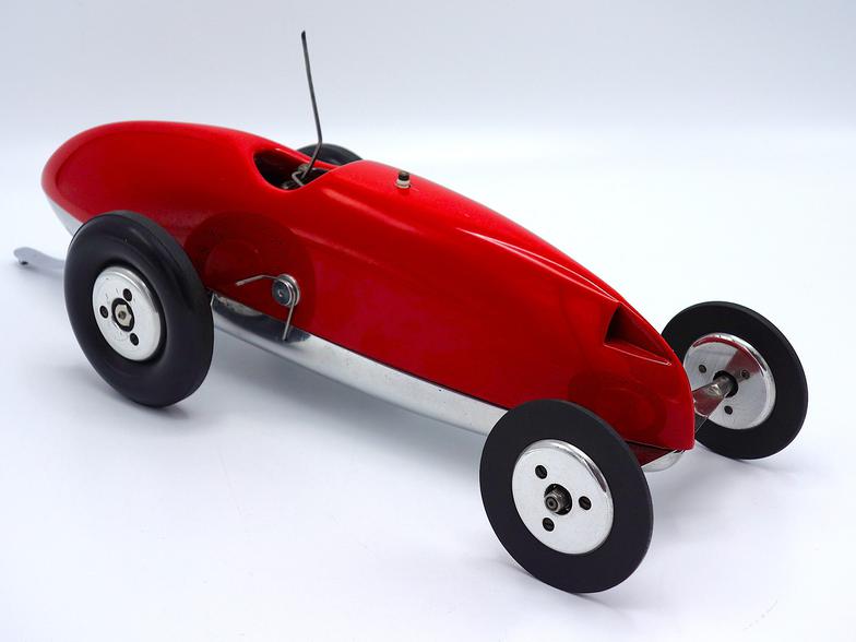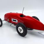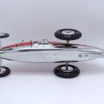 Nonetheless, the car is very racy! The cast aluminum pan appears to be from the late 1950s/early 1960s and does bear some resemblance to the .60-size 1234 pan. The body is hand carved wood. The two-piece aluminum wheels appear to be die-cast aluminum Hornet Mite wheels. The rear tires are 3 inch diameter C-R semi-pneumatic tires, while the