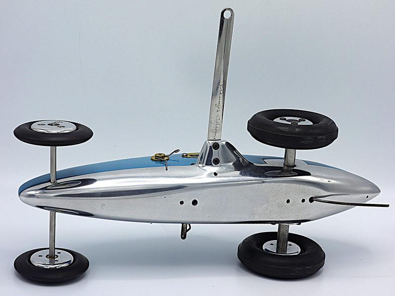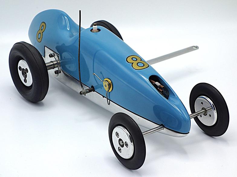Bert Kuebler performed the machine work on the car, and added one of his signature stainless steel fuel tanks and fuel shut-off's. The car is powered by a Dooling 29 engine which was modified by Franny Wolf. Franny Wolf also contributed the stainless steel flying wire pan handle. The hand carved wood body was made by Kuebler.