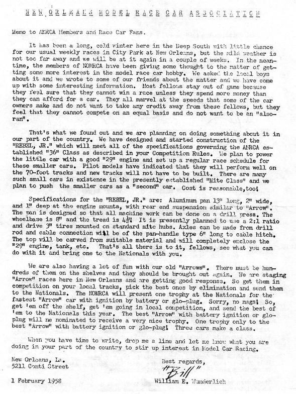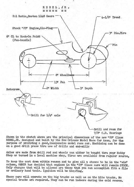 The Rebel, Jr. was introduced in 1958 by the New Orleans Model Race Car Association, led by the club president Bill Wunderlich and Larry Macaluso. The Rebel, Jr. was designed to satisfy the competition rules requirements of the AMRCA .29 Mite class, while still being inexpensive and relatively easy to build by someone with moderate skills. The New Orleans club did not sell completed cars; rather the buyer received only an unfinished aluminum pan casting, along with a hand-drawn sketch showing the principal dimensions of the car, plus a few recommendations for finishing the car.