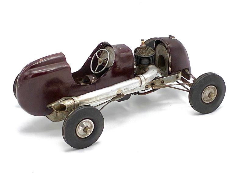 This Class A tether car was designed, built and raced by Virgil Thompson, who lived 60 miles south of Chicago near Kankakee, IL. Thompson was a skilled craftsman who, in addition to being employed as a tool and die maker, also owned a bicycle shop in Watseka, IL and built houses on the side (including his family's home on the Kankakee River).
