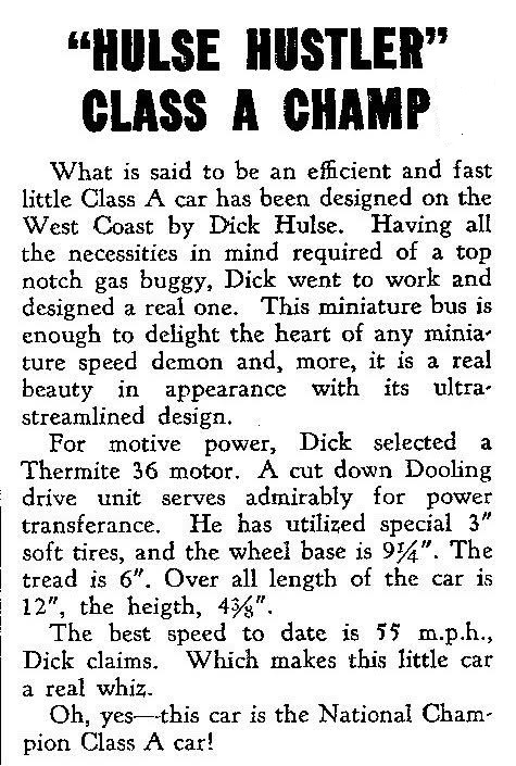 Because of safety concerns related to the higher speeds of the larger .60-size cars, Hulse was one of a small number of proponents of the smaller mite cars. In an effort to demonstrate the competitiveness of the Class A cars, Hulse designed and built his own ".36-size" race car, the Hulse Hustler. Using a cut-down .60-size Dooling drive unit and .60-size wheels and tires, the Hulse Hustler was not much smaller than a typical Class B car of that era. Only a handful of the cars were produced, and most were powered by pre-war Forster .29 spark ignition engines.