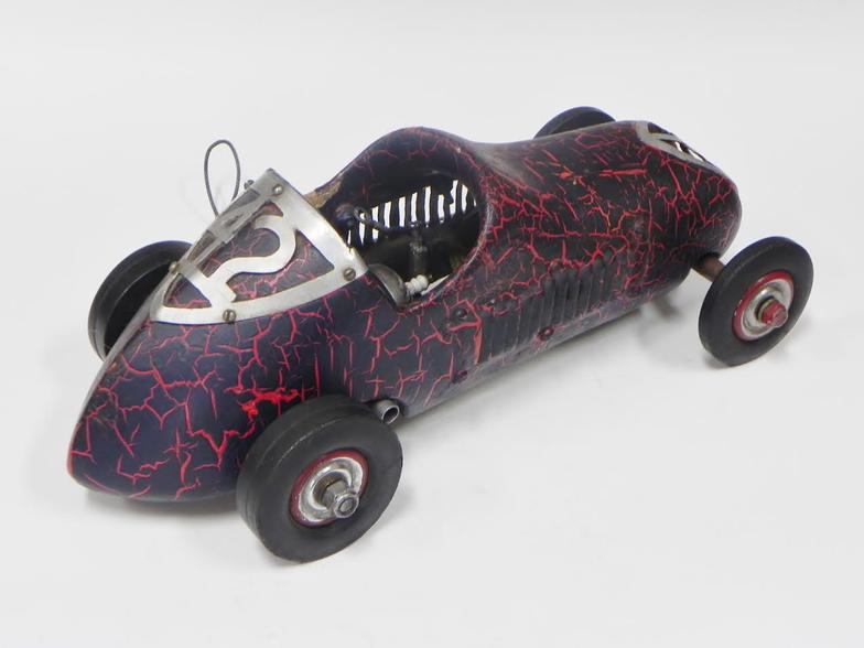 This one-off home-built mite car (circa 1942) was designed and built by “Barney” Lathrop of Buffalo, NY. The chassis was formed from sheet aluminum chassis and the body is hand-carved wood with an aluminum grill and number plate. The wheels and tires, along with the Bunch Mighty Midget spark ignition engine and motor mount, were salvaged from a Dooling PeeWee which had previously been wrecked.