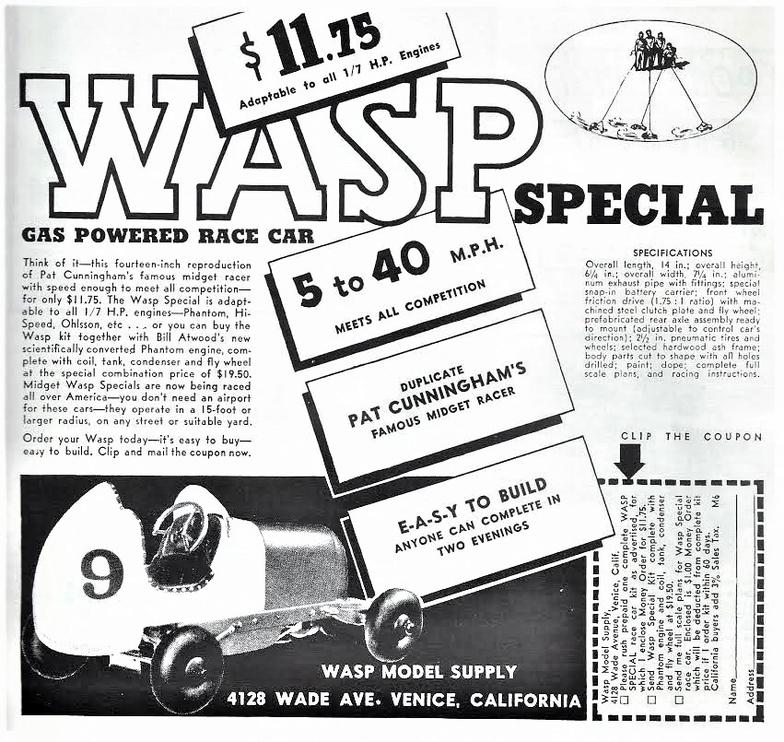 The design of the Wasp Special was based on that of the Clyde Jones Offy midget driven by Pat Cunningham at the Gilmore Stadium race track during the 1938 racing season. The car was sold in kit form by the Wasp Model Supply Co. of Venice, CA.