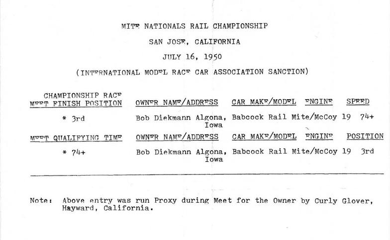 While a Babcock Rail-Mite did not win the 1950 Mite Rail Nationals, Glover proxied Diekmann's car to a 3rd place finish in the event. When he returned the car to Diekmann after the event, Glover enclosed a letter indicating that the car " ... had the event cinched" until the screws securing the front cover of the McCoy .19 crankcase came loose on the next-to-last lap of the final heat race, slowing the car and relegating it to a 3rd place finish. Following that event, the car never raced again.