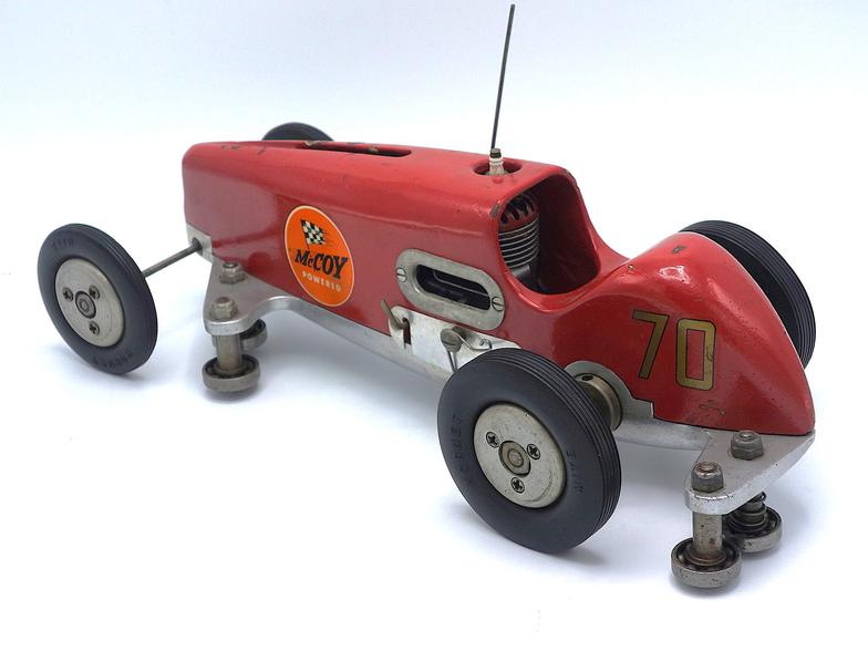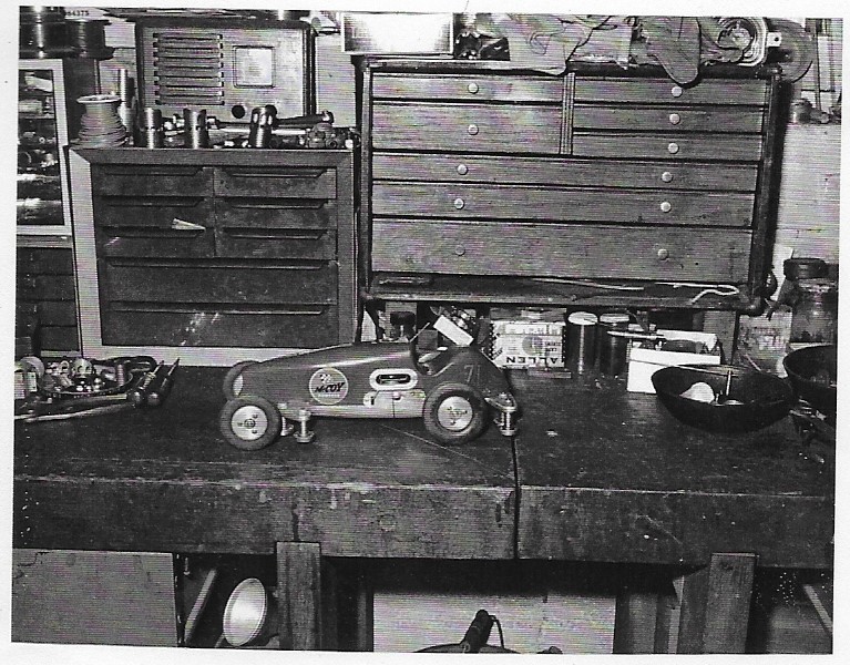 The car shown in the photos was John Carlson's personal McCoy .19 powered rail mite. Carlson raced the car briefly on the small indoor rail track owned by the Chicago Mite Car Club. The 1/48th mile, oval-shaped 4-rail track had 35 degree banked turns and was located in the basement of the Calumet Park field house in Chicago. Although the track was originally intended for .09-, .19- and .29-powered rail mites, it soon became apparent that the cars powered by the larger engines were simply too powerful for the small track and competition was then limited to .09-powered rail mites only.
