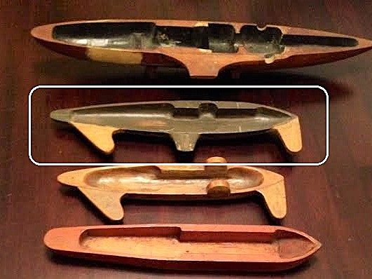 In designing his rail mite pans, John Carlson often simply modified the designs of his successful tether car pans by adding rail guide mounts to the sides of the wood patterns used to cast the pans. The photograph showing the different wood patterns for Carlson's pans clearly illustrates how he added rail guide mounts to what was originally a tether car pan pattern to produce the pattern for a rail mite pan.