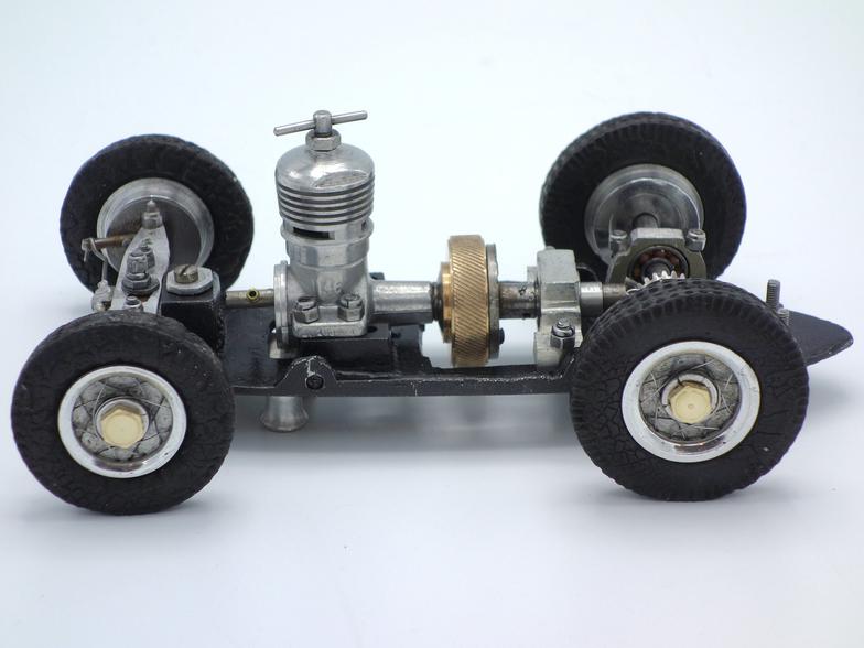 The English rail car shown in the photos was produced and sold in kit form by Model Road Racing Cars, Ltd. (MRRC), a company founded by Henri Baigent for the manufacture of diesel engine powered rail cars. This particular example consists of a cast aluminum MRRC chassis with a formed sheet aluminum body styled after the Cooper 500 Formula 3 race car. The car is powered by a 1.46 cc E.D. Hornet diesel engine with bevel gear drive and a centrifugal clutch to facilitate starting the car. The car is fitted with the original wire wheels and tires provided by MRRC.
